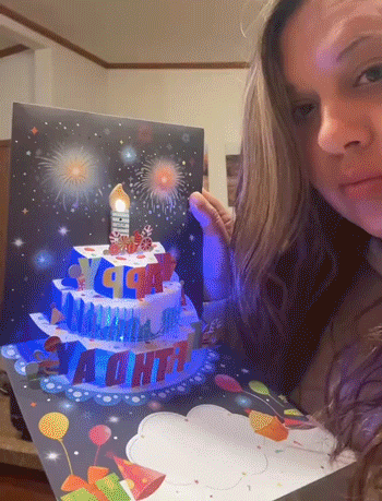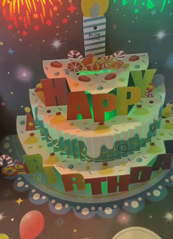 3D cake pop up then vibrant fireworks sparkle and shine - festive and delicious cake pop up, automatically play 'happy birthday', the fireworks change color and sync with loud music, don't settle for a boring birthday card when you can send one that truly sparkles and shines!
