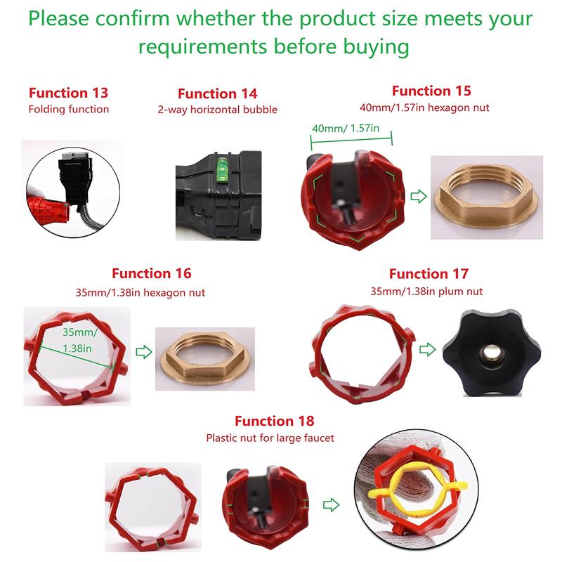 Foldable design makes it easier to turn hard-to-reach mounting nuts on faucets, sprayers, and ball cocks. Just snap the position and rotate quickly, then replace the nut installed from the faucet.